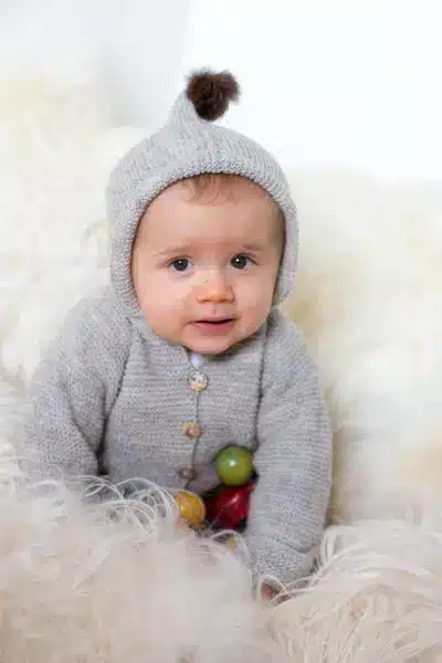 Til den grågrønne model er brugt Bomulin fv 46 og Silkmohair fv 67