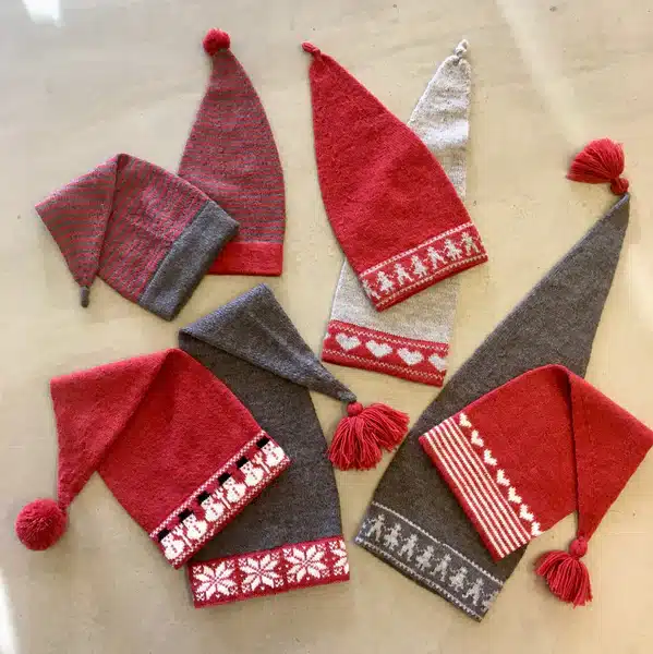 Strikkede nisserhuer er indbegrebet af julehygge og her får du opskriften på hele 6 varianter i børnestørrelser og 3 varianter i voksenstørrelse.