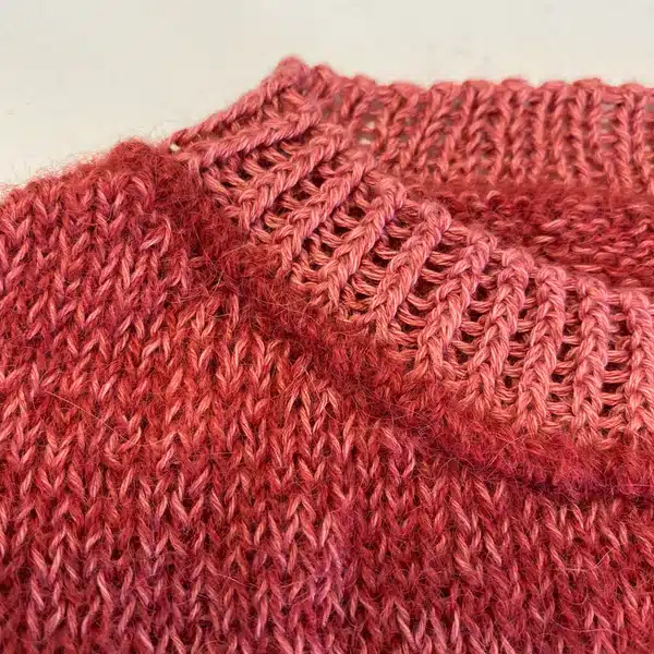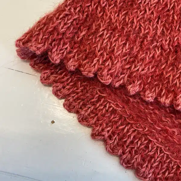 Den røde model er strikket i Trio fv. Blush og Alpaca 1 fv. 21